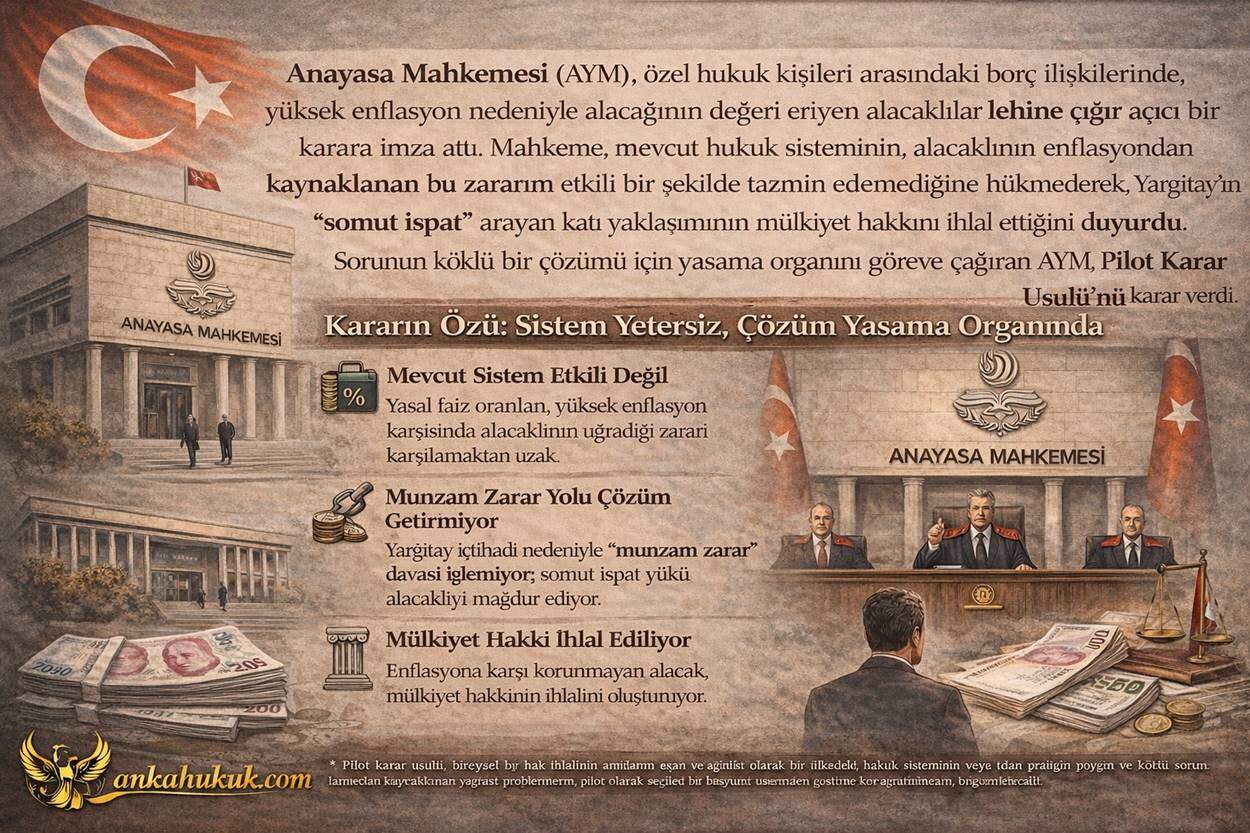 Anayasa Mahkemesi (AYM), özel hukuk kişileri arasındaki borç ilişkilerinde, yüksek enflasyon nedeniyle alacağının değeri eriyen alacaklılar lehine çığır açıcı bir karara imza attı. Mahkeme, mevcut hukuk sisteminin, alacaklının enflasyondan kaynaklanan…