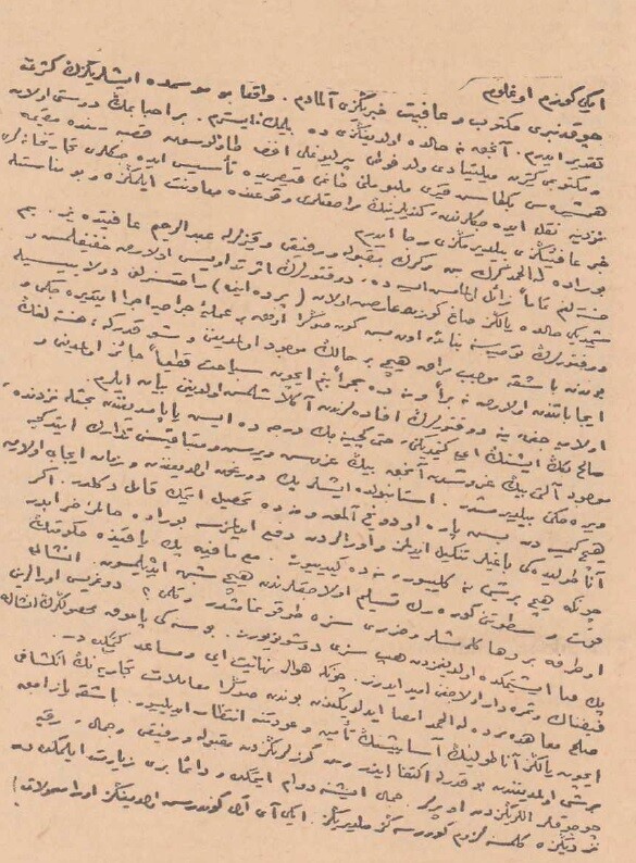 Çoktanberi mektup ve afiyet haberinizi alamadım. Vakıa bu mevsimde işlerinizin kesretini takdir ederim. Ancak ne halde olduğunuzu da bilmek isterim. Bir ahbabınım dostu olan ve mektubumu getiren Miltiyadi, Veled Foti Perlioğlu Efendi, Tavloson kasabasında mukime hemşiresi Bektaş kızı Melbomeleni Hanımı alıp Kayseride te’sis edecekleri ticarethaneleri nezdine nakledeceklerinden, kendilerinin müracaatları vukuunda muavenet eylemenizi ve bu münasebetle haberi afiyetinizi bildirmenizi reca ederim. Burada le-hül-hamd gerek ben ve gerek Makbule ve refiki ve kızlarla Abdürrahim afiyetteyiz. Benim hastalığım tamamen zâil olmamış ise de, doktorların eseri tedavisi olarak hafiflemiş ve şimdiki halde yalnız sağ gözüme arız olan (perde inme) rahatsızlığı dolayısile doktorların tavsiyesine binaen onbeş gün sonra ufak bir ameliyei cerrahiye icra ettireceğimi ve bundan başka mucibi merâk hiç bir halin mevcut olmadığını ve şu kadar ki, hastalığın icabatından olarak ne berren ve ne de bahren benim için seyahat katiyyen caiz olmadığı ve olamayacağı, gene doktorların ifadelerinden anlaşılmış olduğunu beyan eylerim.